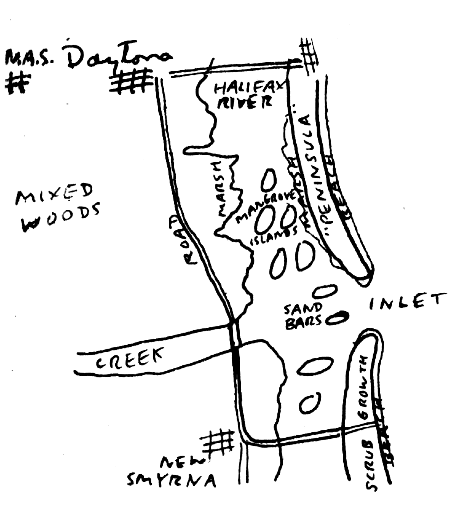 On my last day off I didn’t go very far afield because of a farewell party for the Captain scheduled for the evening, and took a train, accompanied as usual by my bicycle, south about 15 miles to New Smyrna, which is near the mouth of Ponce de Leon inlet (the mouth of our Halifax River), bicycled around there for a few hours and then back to the N.A.S. In so doing I found out that the gray kingbird, which I had never seen before, was actually common. The inlet is a good place for shells, as I had discovered some time ago on the Daytona side, so I collected some more.